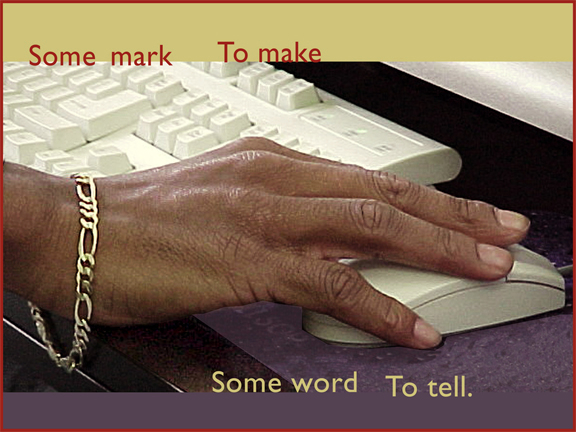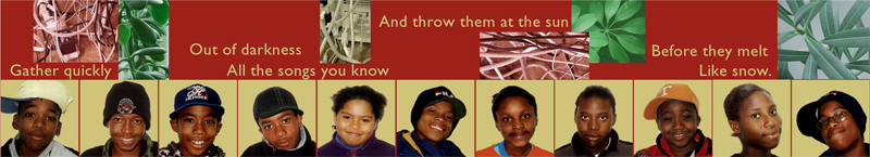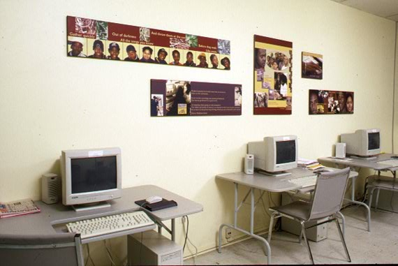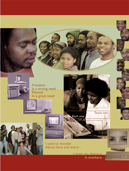 Installation of five panels of photographs and text for the computer room of the Syme Woolner Community Association, Woolner Avenue, Toronto. I consulted with members of the community and collaged their photos of each other with texts by Langston Hughes and Patrice Malidoma Some. 1999.