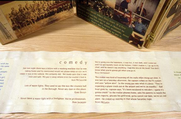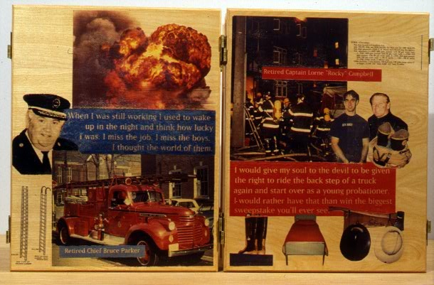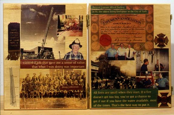 An installation in the administrative offices of the former City of York Fire Department at Lawrence and Weston Road in Toronto. I interviewed over twenty firefighters and constructed a wooden “book” of eight “pages”, each collaged with historical and contemporary images and quotes. A text panel displays excerpts from interviews: “Comedy”, “Tragedy”, “Work” and “A Sense of Time and Place”. Four banners hang from the 17’ foyer: Fire, Water, Courage, Pride. 1998.