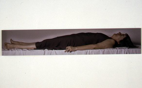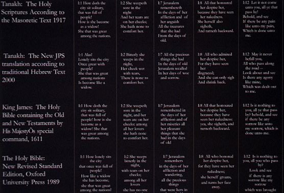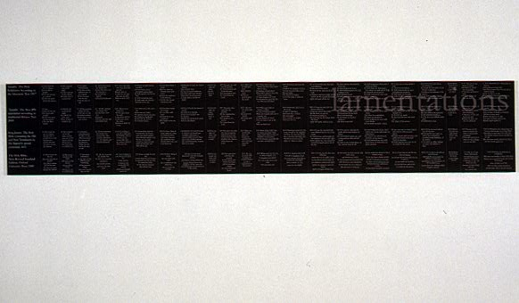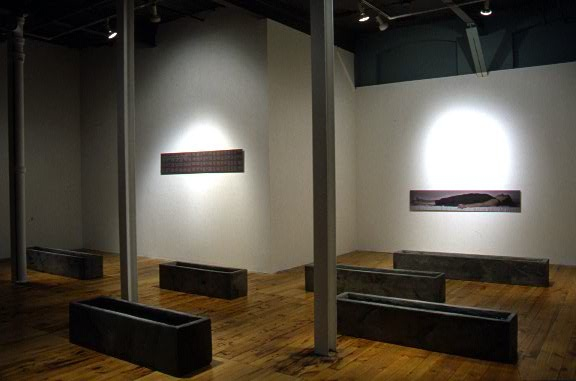 An installation at the Red Head Gallery, Toronto.. Six cement troughs, 13″ wide and 13″ high, varying in length from 3 1/2′ – 6′, filled with water; a photographic self-portrait, after Holbein’s Body of the Dead Christ in the Tomb; and a text panel with excerpts from four translations of the Book of Lamentations, in which the destroyed city of Jerusalem is a metaphorical widow. 2005.