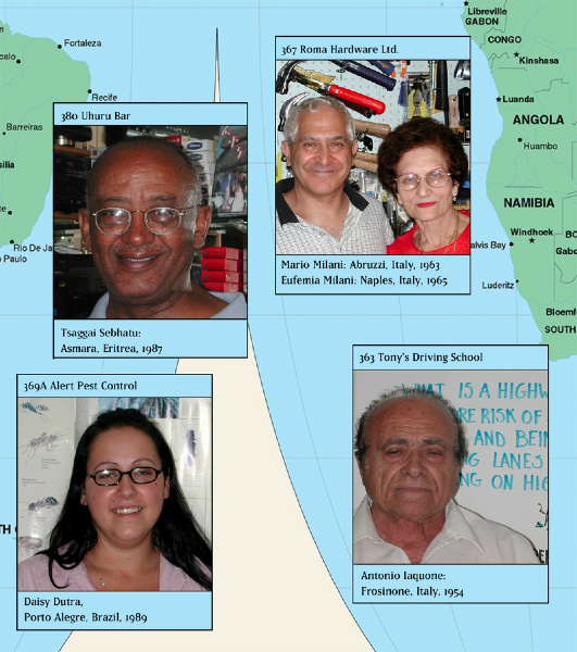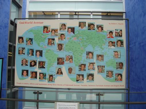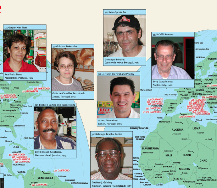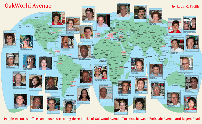 I photographed people in stores and small businesses, for the two blocks where my studio was located, on Oakwood Avenue in Toronto. The strip is a nondescript conglomeration of dollar stores, a pest control center, a driving school, a drugstore and so on. It is anchored by a beautiful community library, the Oakwood Village Library and Art Centre. I asked everyone where they were from and the year they came to Canada, and placed their pictures on a map of the world. The piece, 6′ x 4′, was on display in the library for ten years. 2002.