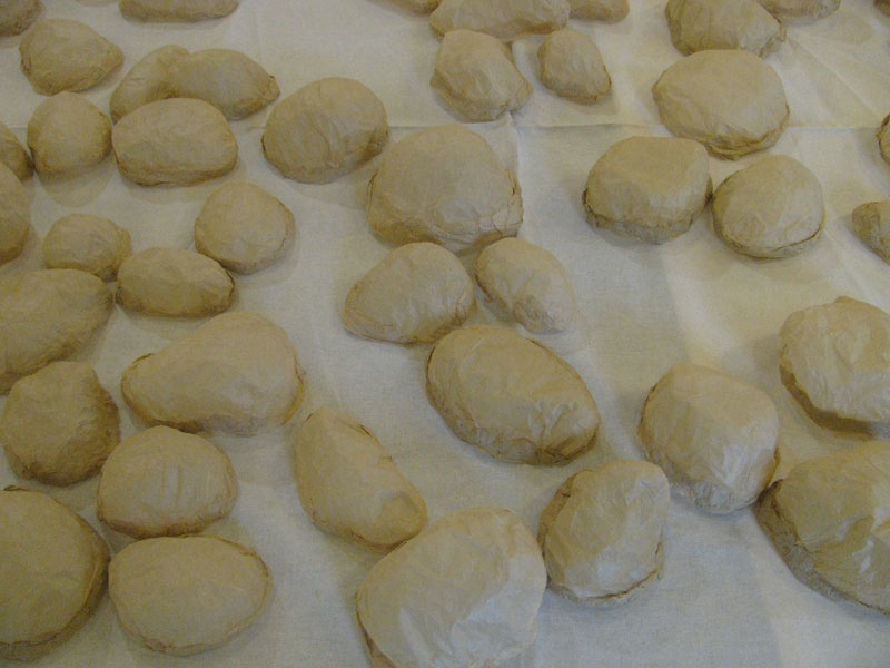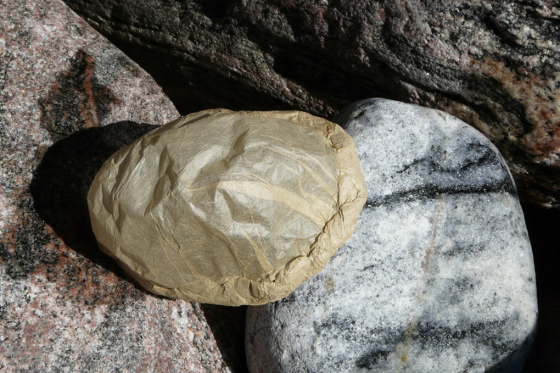 I made paper “ghosts” of the forms of the rocks, using translucent washi paper; then I made wooden plaques of all the colours of the rocks. The rocks, “ghosts” and coloured plaques were exhibited at the Penetanguishene Centennial Museum. Summer, 2010.