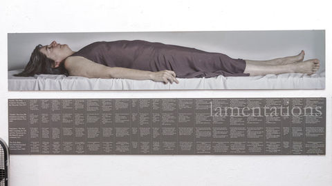 A text panel with excerpts from four translations of the Book of Lamentations, in which the destroyed city of Jerusalem is a metaphorical widow